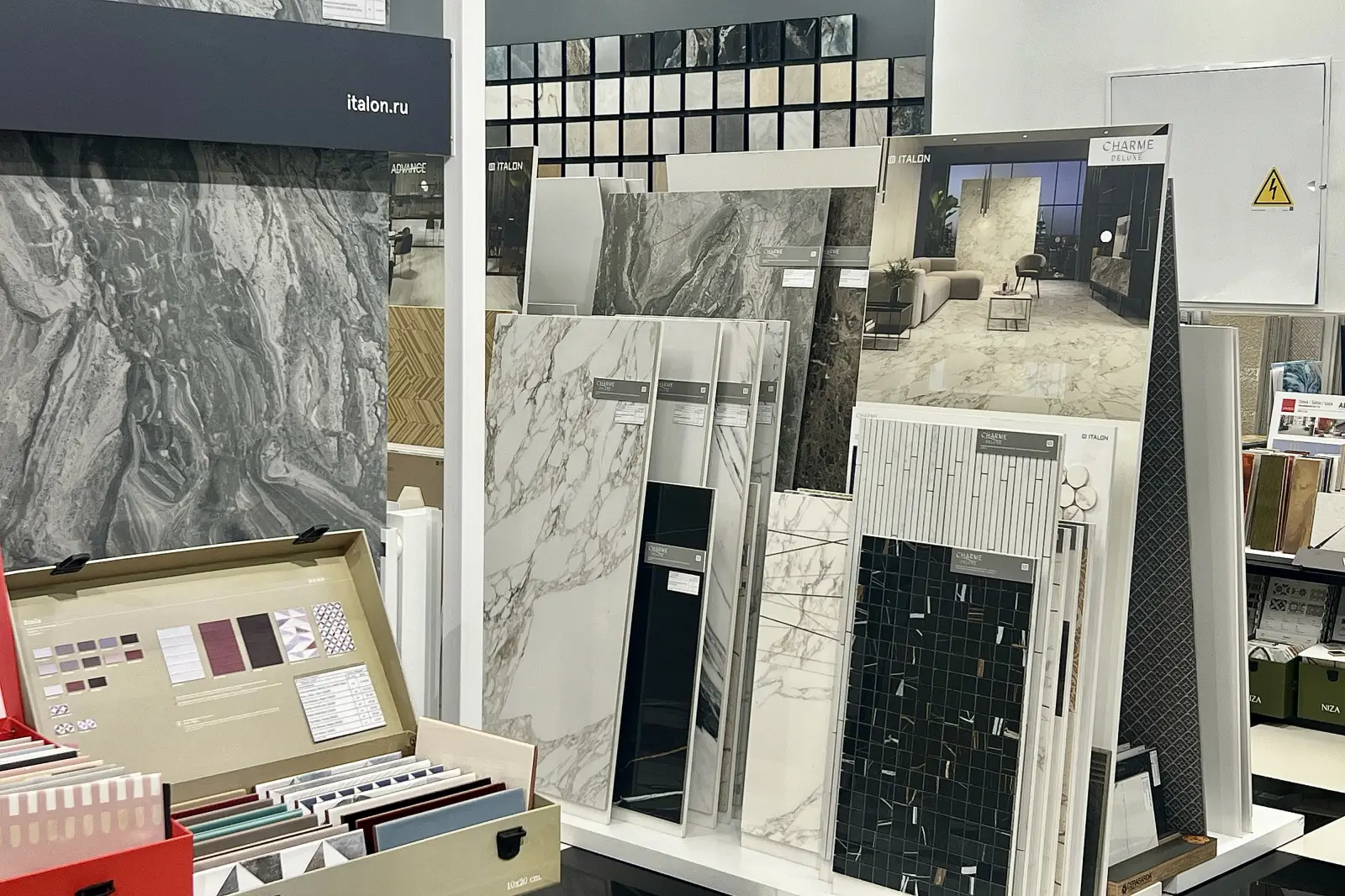 Большой выбор плитки от самых маленьких до крупногабаритных размеров; на самый разный бюджет и запрос.